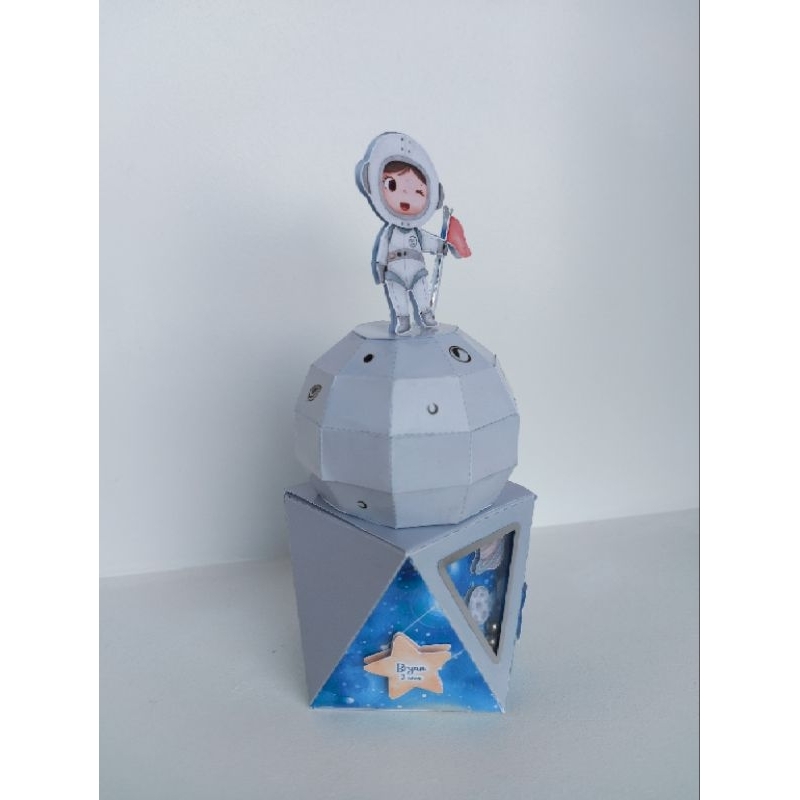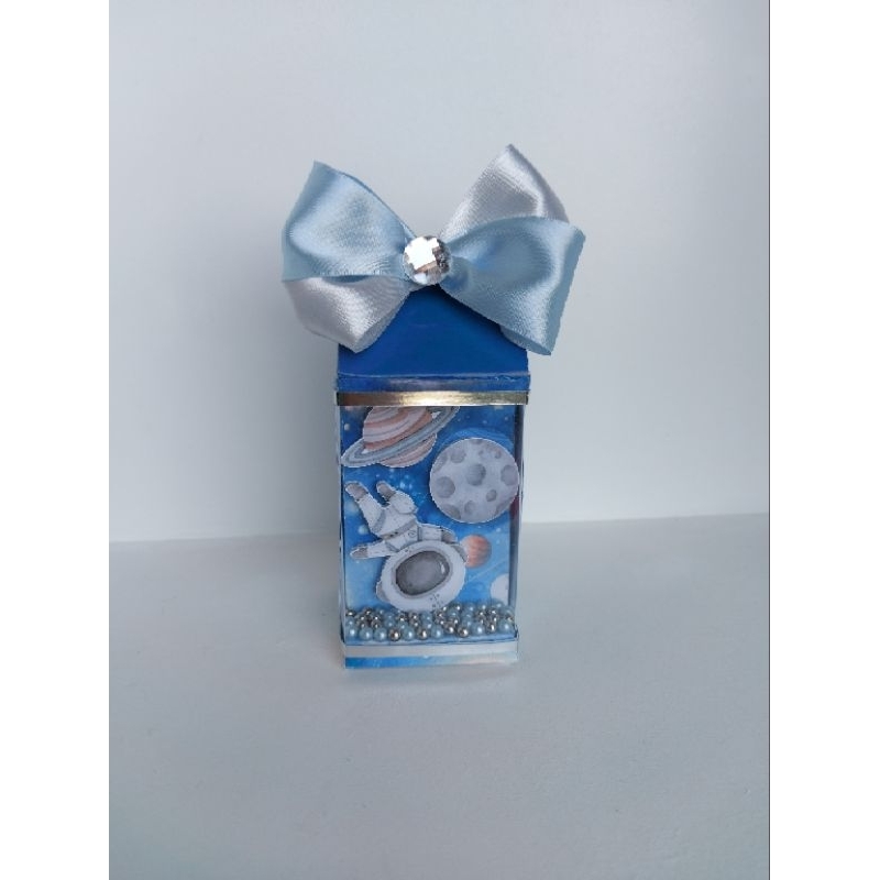 O conjunto inclui caixas com formatos diferenciados e aplicações em camadas que criam um efeito visual rico e sofisticado. Os tons de azul, prata e detalhes delicados reforçam a temática espacial, enquanto os personagens astronautas dão um toque lúdico e encantador à decoração.
